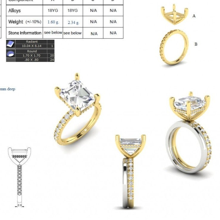 Radiant cut 4.35ct Engagement Ring. Lab Diamond or Moissanite