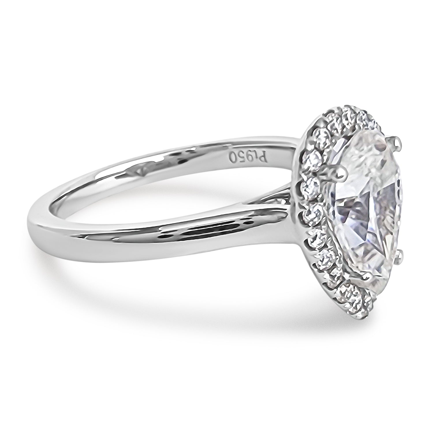 Gorgeous 1.72ct Pear cut Engagement Ring with Halo and a plain band. This beautiful ring has a 1.55ct centre gemstone and 0.17cts of gemstones in the halo, making it a 1.72ct total gemstone weight.