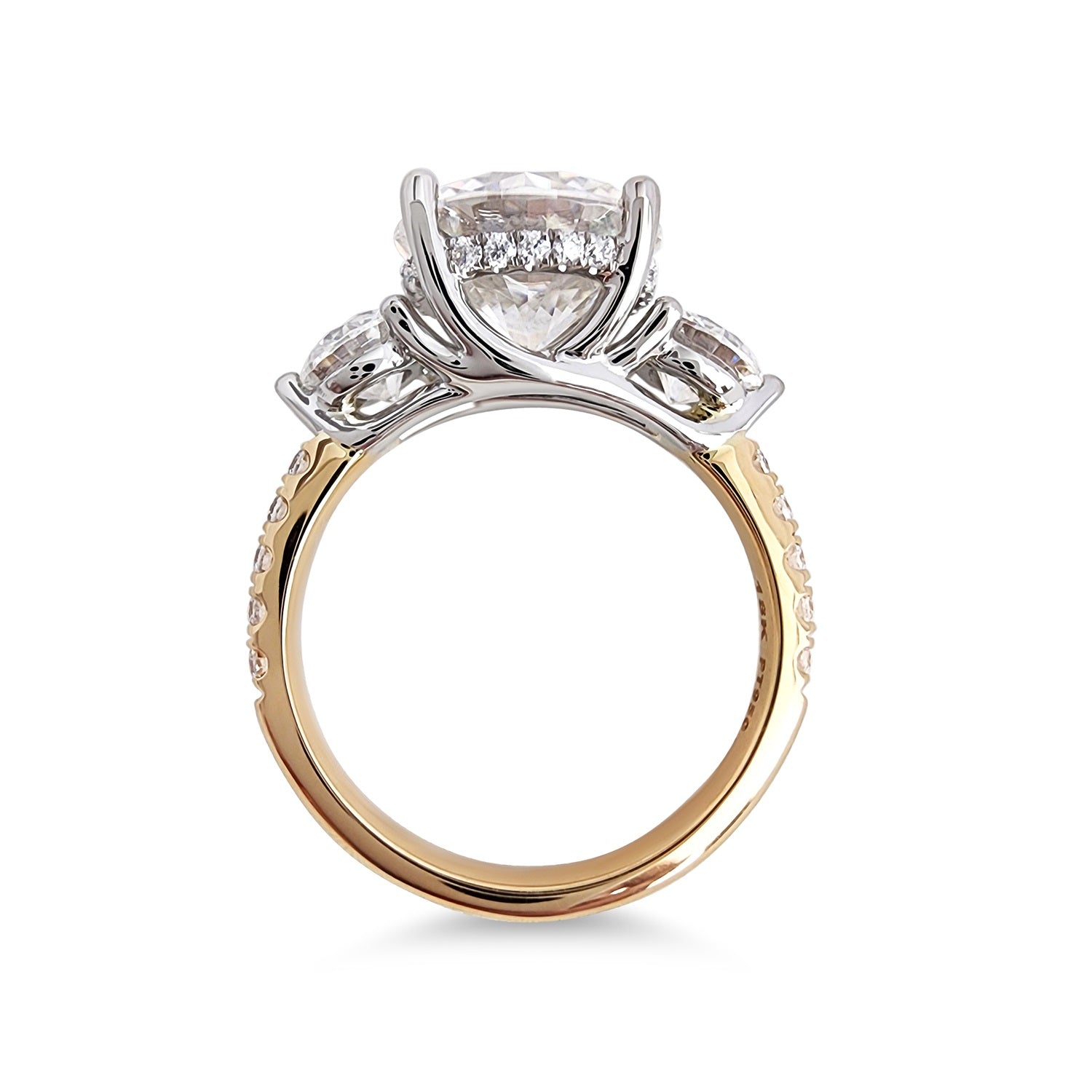 Boosting a 4ct round cut hero, centre gemstone, with 2 matching 0.5ct round cuts on the shoulders, gemstones in the band and finished with a sneaky hidden halo. Total carat weight of 5.3cts.